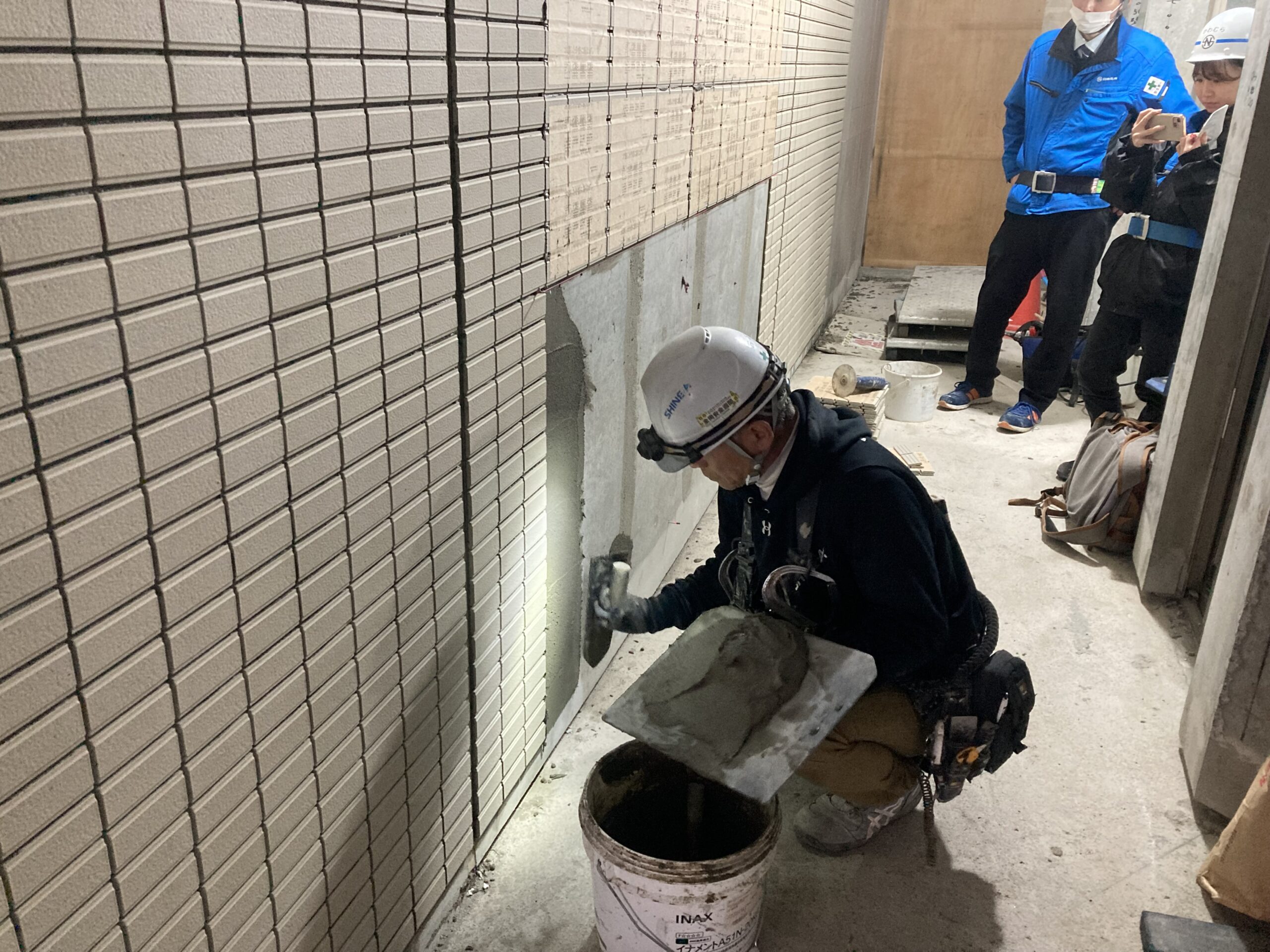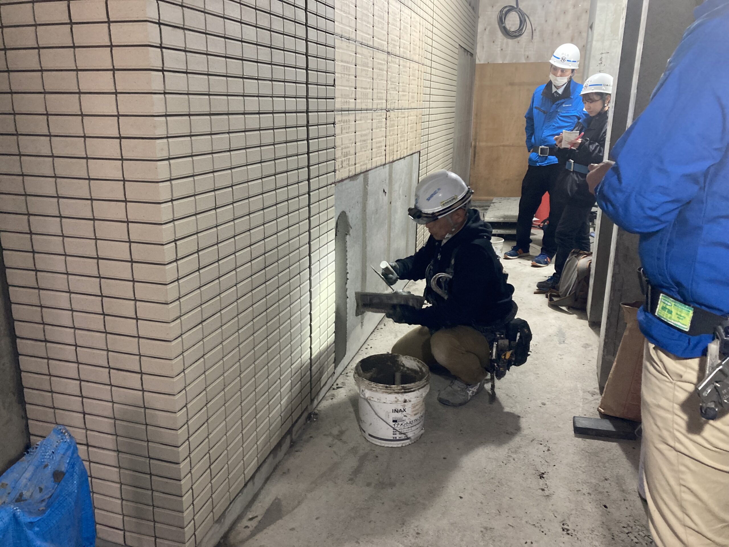 タイルの貼りつけ材メーカーの日本化成様と新商品の試験施工です。